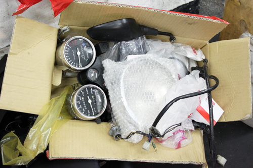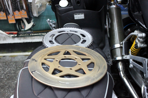 當然雙錶、大燈、前上下三角台也通通都拆下來。雙錶的兩個電鍍背面蓋,還有料直接叫新的電鍍蓋來換。因為大燈碗公鏽的利害,外表雖然可以弄亮,但是為了更完美也直接叫新的大燈碗公。前總成的部分還有碟盤,拆下來上漆。連後齒盤也一起噴一噴。