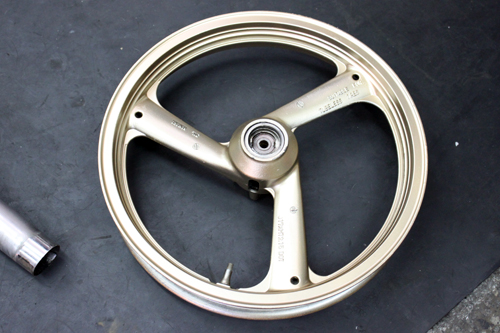 前後輪框也是拆下來上漆。而輪胎的部分則式思考了很久,因為預算的限制,沒有辦法用上前後BT39SS。因此開始鎖定國產的胎,我想我也不會每天都在極限,所以應該是還好。搭配前輪90/80-17 後輪130/70-17前後新胎。要注意的是後輪130已經原廠框的極限,有些130胎寬太大會變形的嚴重,很難騎裝上去也難看,所以選胎要特別注意。
