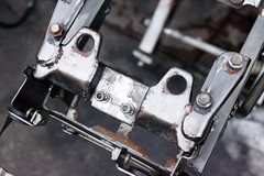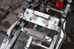 上面看到的這些鏽斑都是要處理的。清洗、除鏽、打磨、上漆、上亮光漆。一個步驟都不能少。仍然覺得可惜的是,這次沒有預算把引擎跟搖臂都卸下來,進行噴砂烤漆。也順便把搖臂的軸承更換。這部分就等待整台車整理好之後,開始尋覓後3.5吋框再來進行。