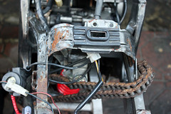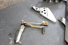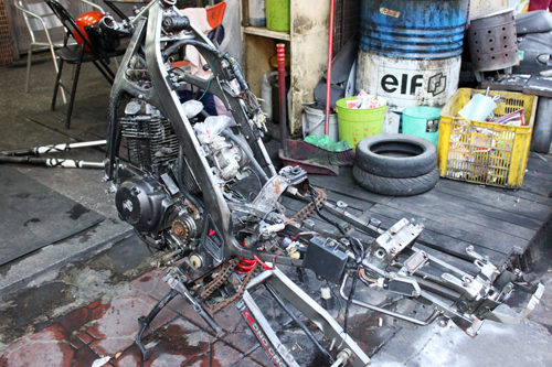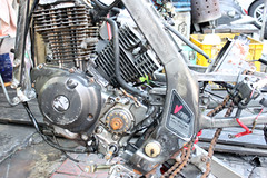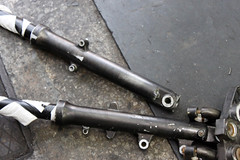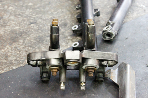 最後來看車架的部分。把引擎、搖臂都留在車上,該包得電線什麼的小心的都處理好。然後用藥水開始咬漆。刷洗。最好見底漆之後進行打磨除鏽、為上冷烤噴漆做準備。