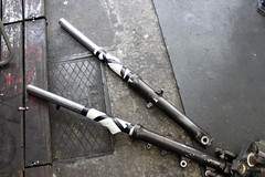 首先先把前總成給拆下來,前叉因為剛牽車就先進行換油、阻尼、土封油封都換過了。所以這次拆下來,要用報紙小心的把這幾個地方都包起來。以免受到藥水的侵襲。因為要用藥水咬掉漆,然後打磨上漆。